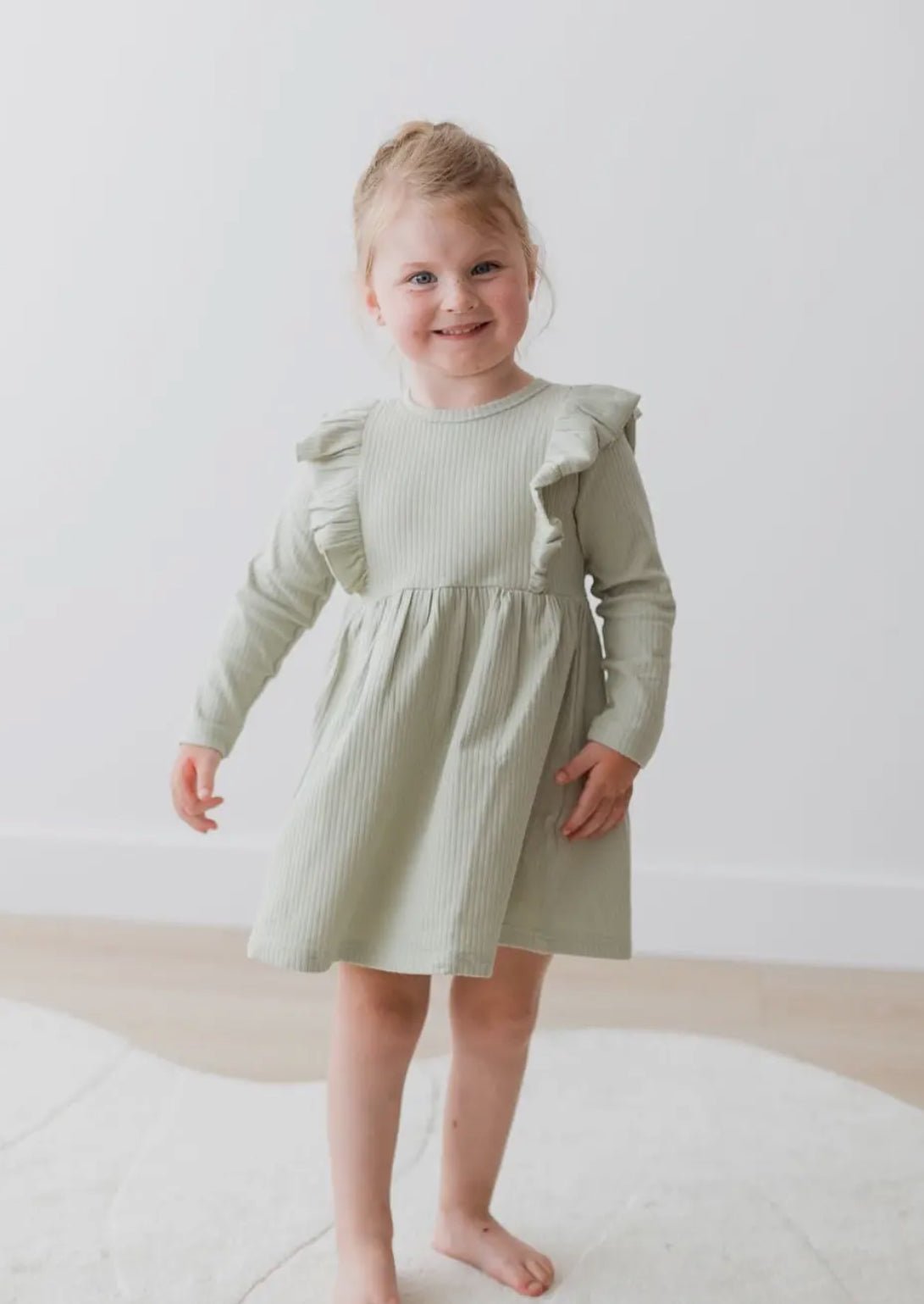 The Cinderella Dress combines form and function with an A-line design, button closure in the back, and ruffle detail. Made with soft ribbed cotton, it is available in blush and pistachio colors, perfect for everyday wear or special occasions like Easter and family photos. Available in infant and toddler sizes.