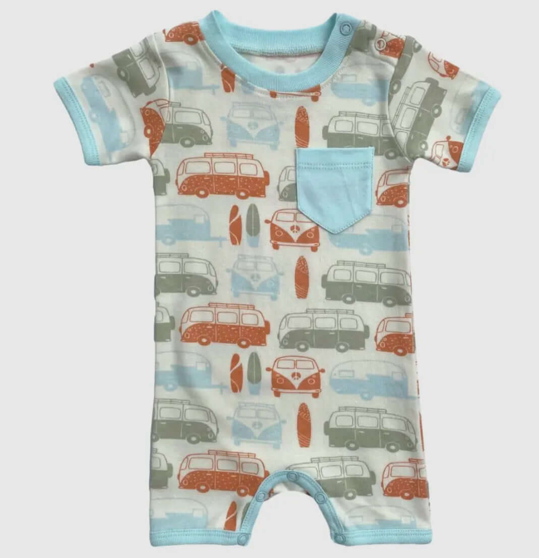 Get ready to hit the waves in style with our Surfing USA Romper. This one piece outfit features a cute vintage bus and surf board design that is perfect for any little adventurer. Made from 100% organic cotton, this romper is not only soft and comfortable, but it is also free from harsh chemicals and dyes. Never waste time looking for matching pieces again, and let your child stand out in this unique and environmentally friendly romper. Get yours today.